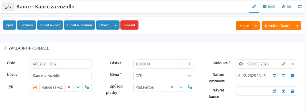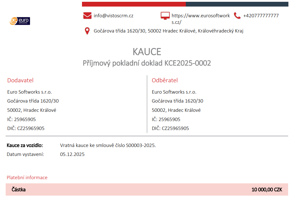 Systém eviduje všechny složené kauce – hotově, převodem nebo kartou – včetně částky, měny, data, typu platby a navázání na konkrétní smlouvu a zákazníka. Celý proces je tak plně transparentní a zpětně dohledatelný, což zjednodušuje provoz a posiluje důvěru klientů.